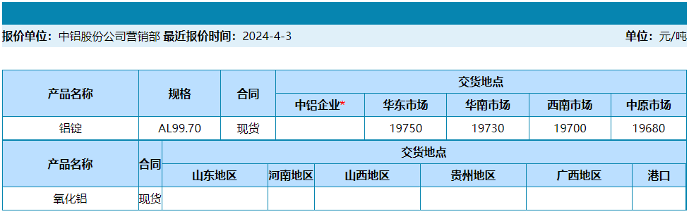 中国铝业2024年4月3日产品报价