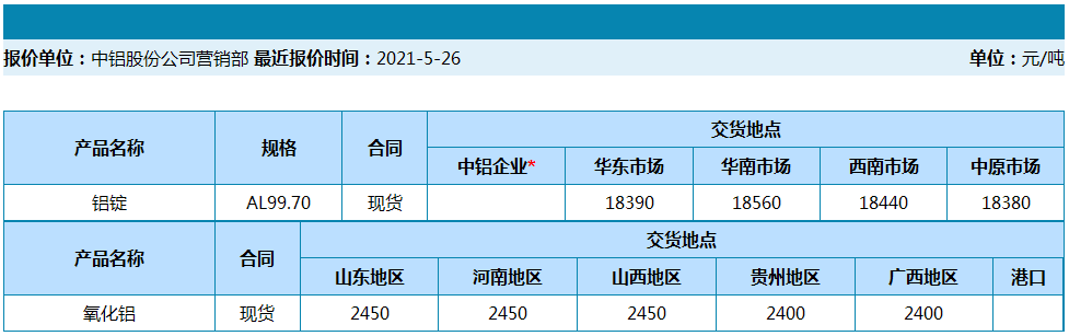 中国铝业2021年5月26日产品报价