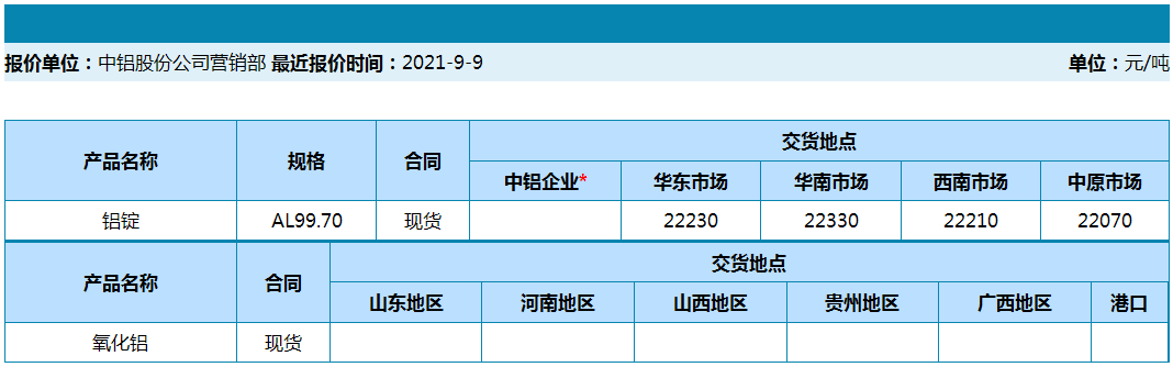 中国铝业2021年9月9日产品报价